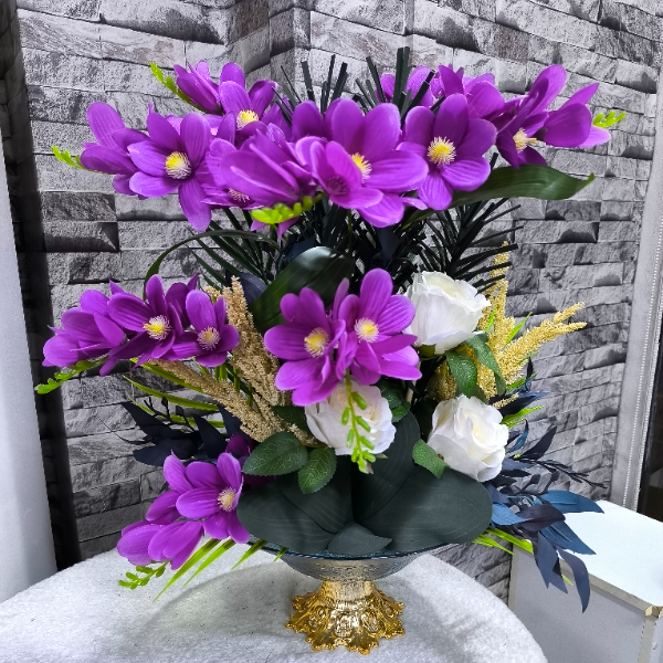 Yaklaşık 60 cm boyunda olan bu ürün çeşitli yapay çiçek ve aksesuarlarla hazırlanan yapay tanzimdir. ( Not: İsteğe göre çiçeğin süslemesi yapıldıktan sonra şerit yazıda yazabiliriz. )