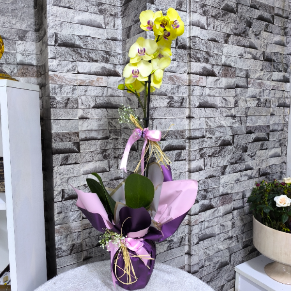 Resim görseldir. Stoktaki orkide gönderilir Seramik vazo içerisinde tek dal orkide çiçeği çeşitli aksesuarlarla süslenerek şık bir şekilde sunuma hazırlanmıştır. Orkide; asalet ve kendine güvenin simgesidir. Ürünün yaklaşık boyu 60-70 cm arasındadır.